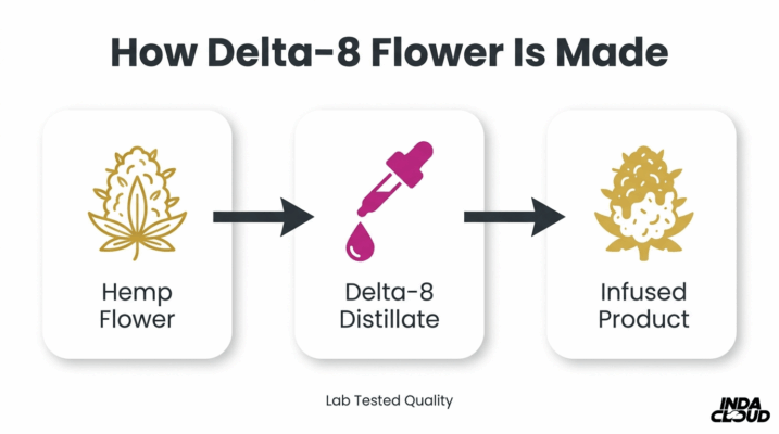 Delta-8 THC flower is made by applying concentrated delta-8 distillate onto hemp flower. The sections below cover the spraying process, differences between infusion and coating methods, and quality indicators to evaluate.