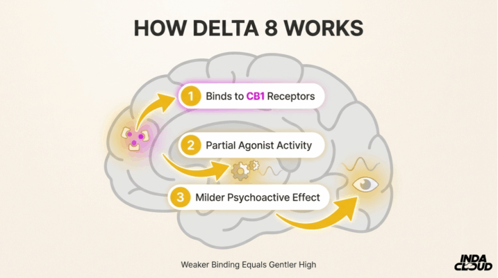 Delta 8 THC gets you high by binding to cannabinoid receptors in your brain and nervous system. The sections below explain its interaction with the endocannabinoid system, the specific role of CB1 receptor binding, and why its high feels milder than Delta 9.