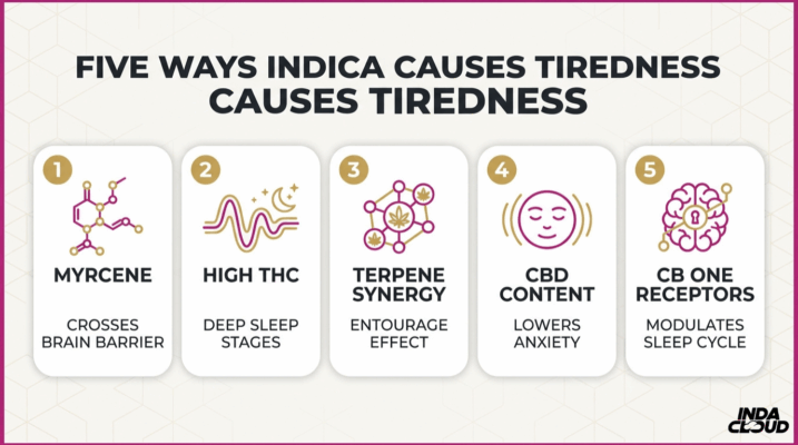 Five factors work together to produce indica’s tiredness: myrcene crosses the blood-brain barrier and boosts GABA, serotonin, and melatonin levels; elevated THC shifts sleep architecture toward deeper slow-wave stages; the broader terpene profile creates a synergistic entourage effect; CBD content lowers anxiety that blocks sleep onset; and direct CB1 receptor activation in the basal ganglia, hippocampus, and cerebellum modulates the sleep-wake cycle.