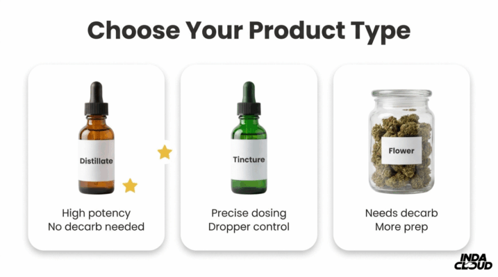 Choosing the right product format shapes every recipe that follows. Distillates offer high concentration and skip the decarboxylation step, tinctures provide precise dropper-based dosing, and raw flower requires heat activation before infusing into fats. Saturated fats like butter, coconut oil, and bacon fat bind cannabinoids far more efficiently than lighter oils, directly affecting how much Delta-8 each serving retains.