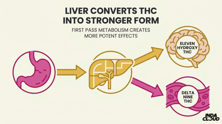 Your liver processes THC from edibles differently by routing it through first-pass metabolism before it enters the bloodstream. CYP2C and CYP3A enzymes convert delta-9-THC into 11-hydroxy-THC, an active metabolite with equal or greater pharmacological potency that crosses the blood-brain barrier efficiently.