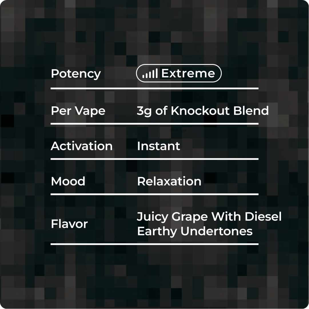 Heavy-duty grape-diesel flavor meets knockout relaxation. 9 Pound Hammer delivers deep calm, restful energy, and potent sedation in a powerful 3g disposable vape.