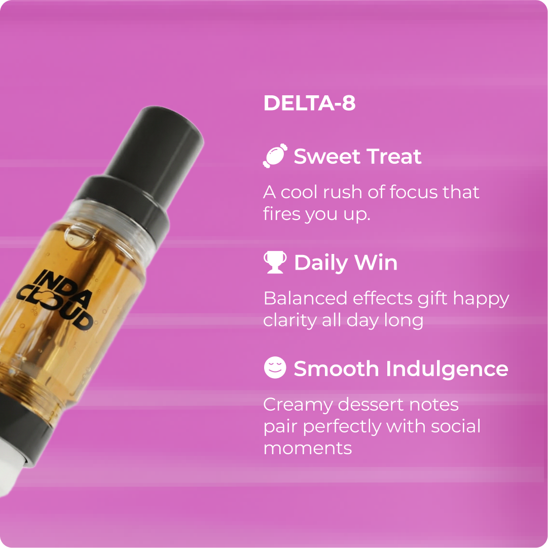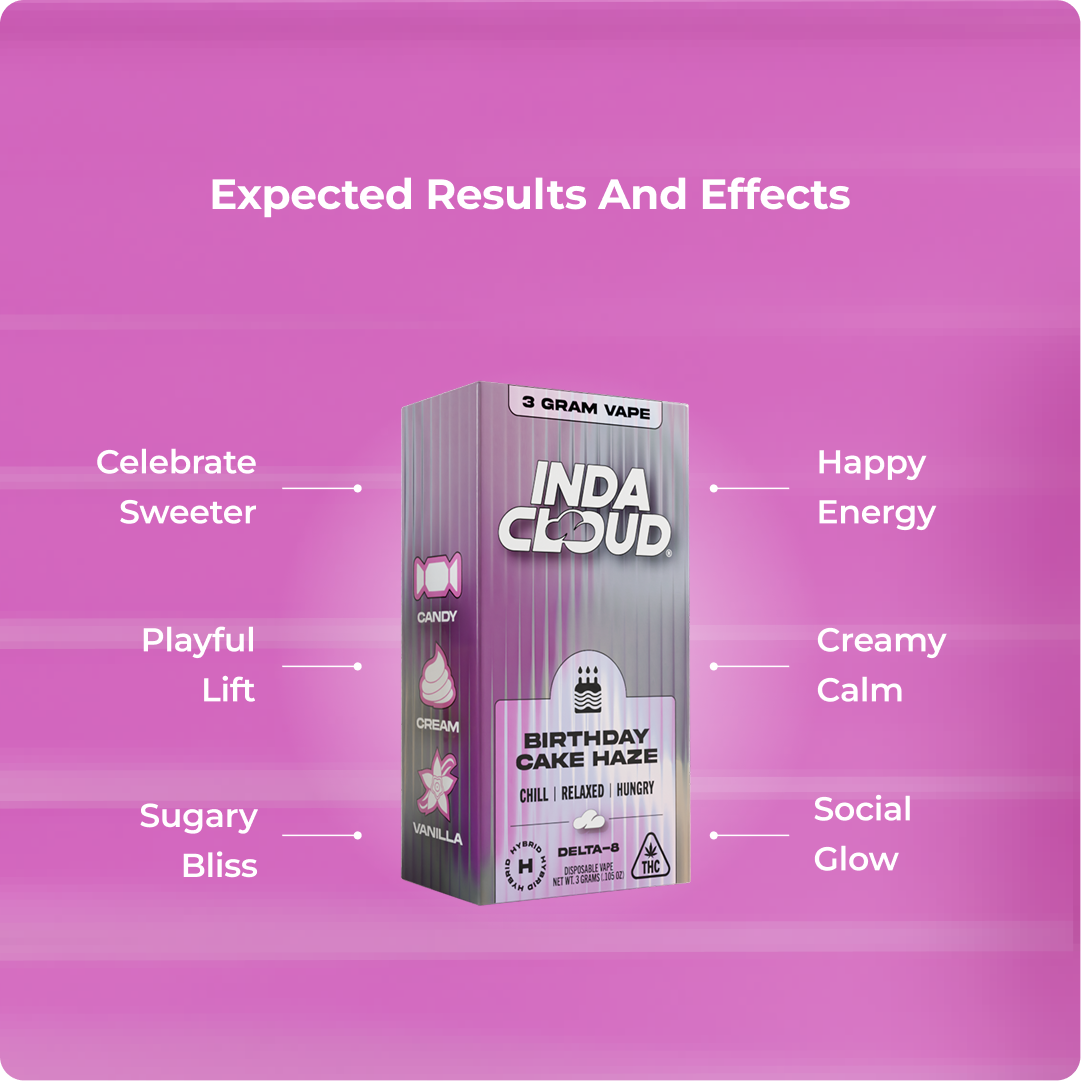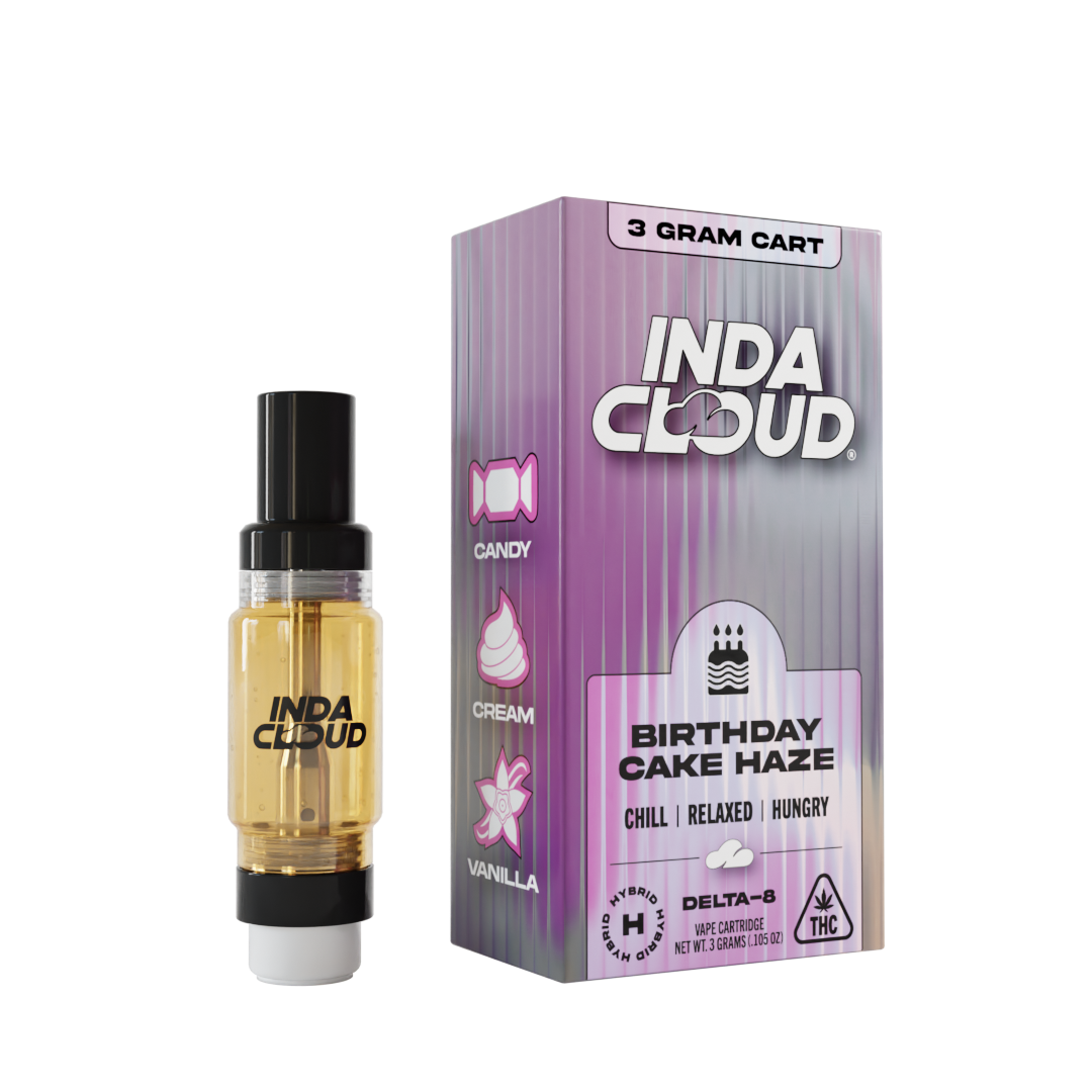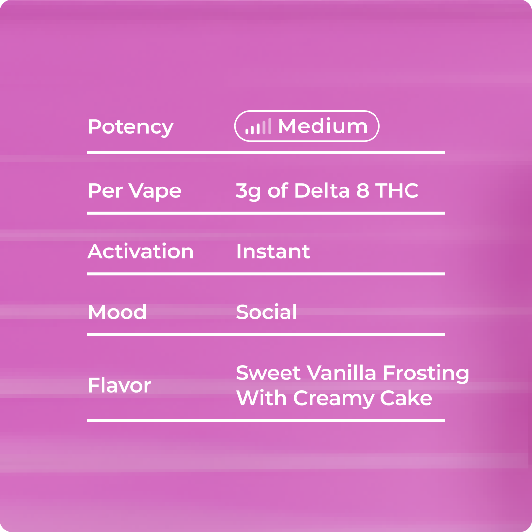 Sweet vanilla frosting pop meets balanced Delta 8 chill with Birthday Cake Haze, delivering mood-boosting euphoria, gentle relaxation, and sugary sweetness in a sleek 3g cartridge.