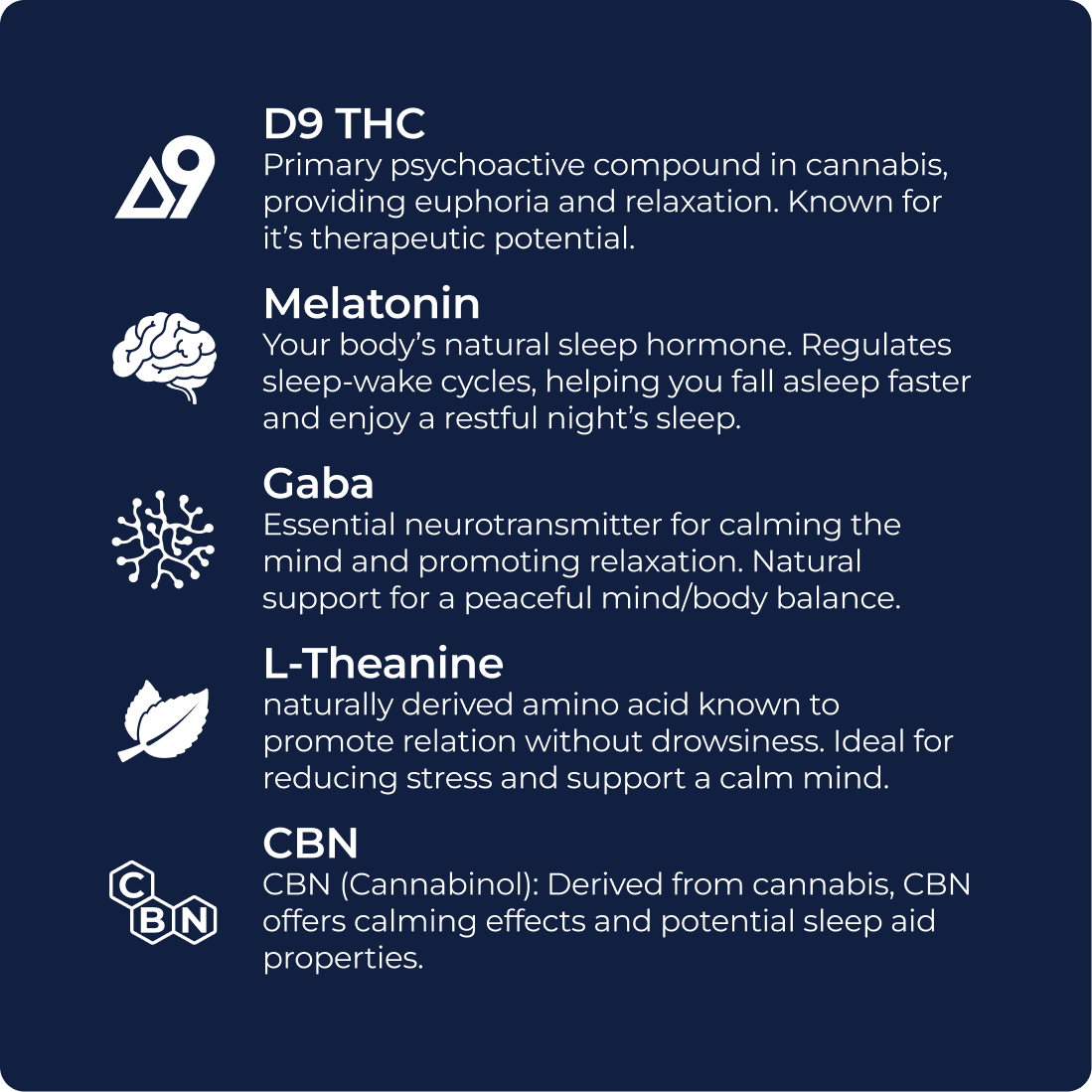 Soluble tapioca fiber, isomalt, water, pectin, citric acid, sorbitol powder, mtc oil, lecithin (from sunflower seeds) natural flavoring, natural color, melatonin, L-theanine, gamma-aminobutyric acid (GABA) hemp derived isomers.