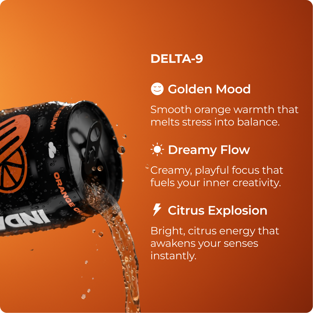 Carbonated RO Water, Natural Flavor, Citric Acid, Acacia Gum, Malic Acid, Tartaric Acid, Sucralose, Natural Orange Color, Salt, Acesulfame Potassium, Hemp-Derived Delta 9 THC