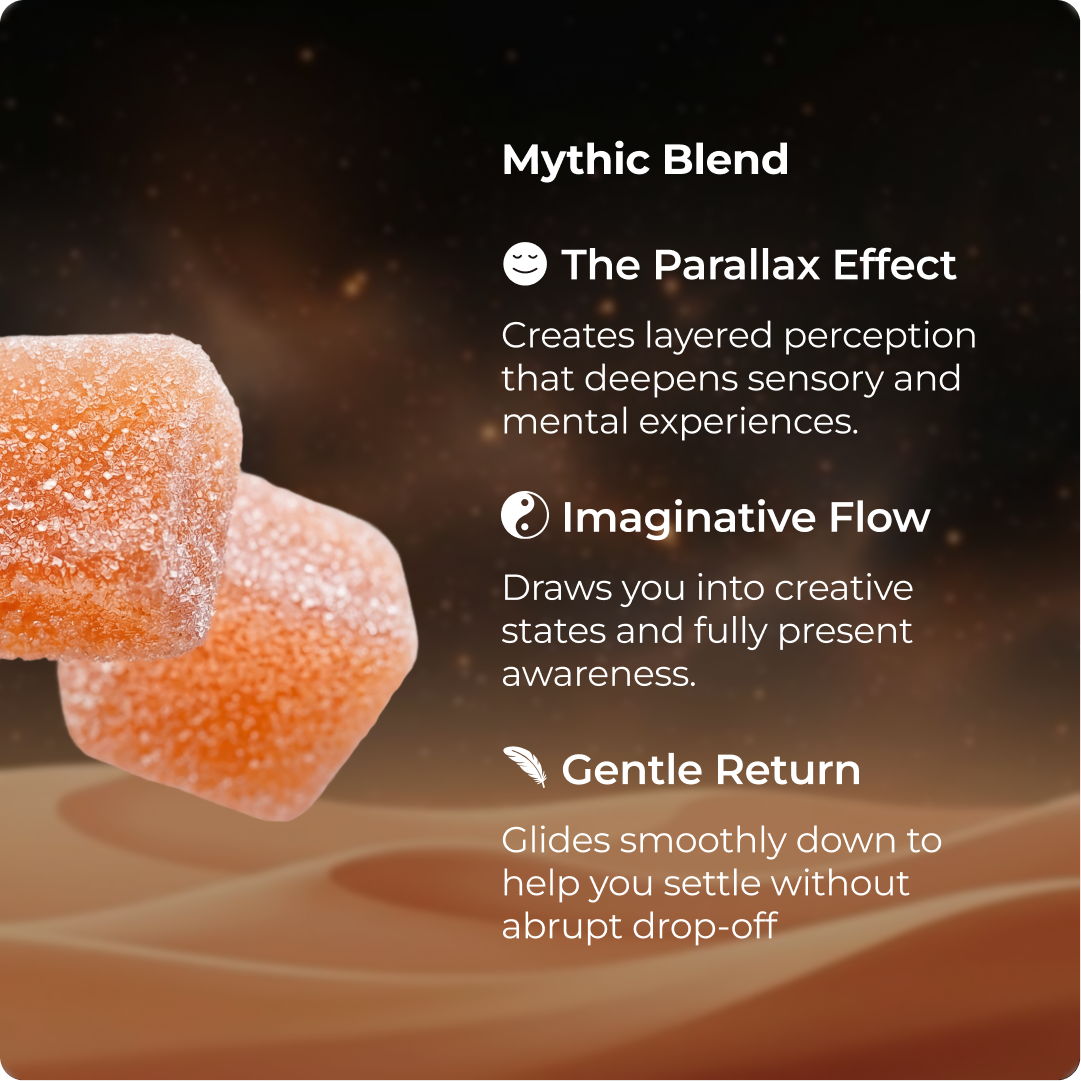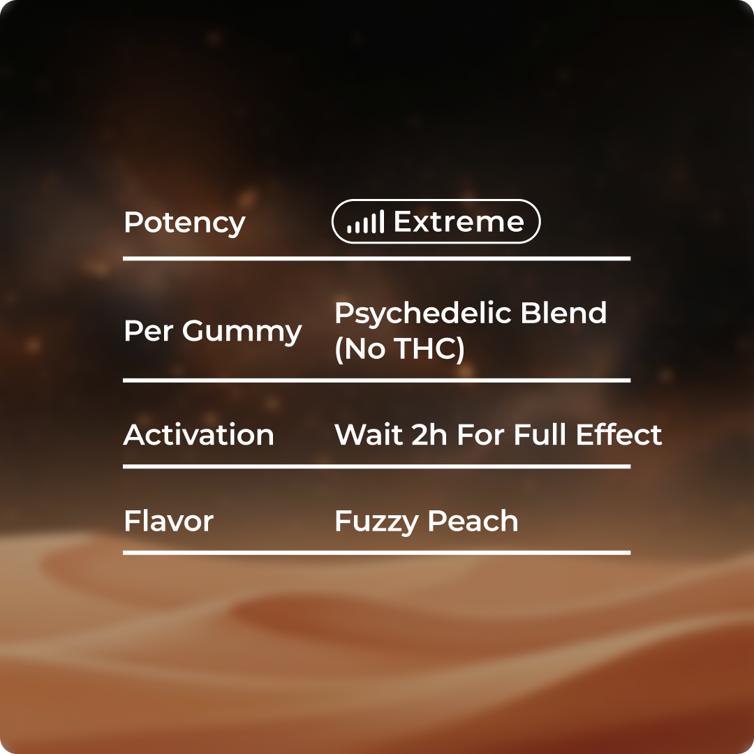 Psychedelic peach gummy blend built for a layered immersion experience paired with euphoric energy and a soft, smooth landing.